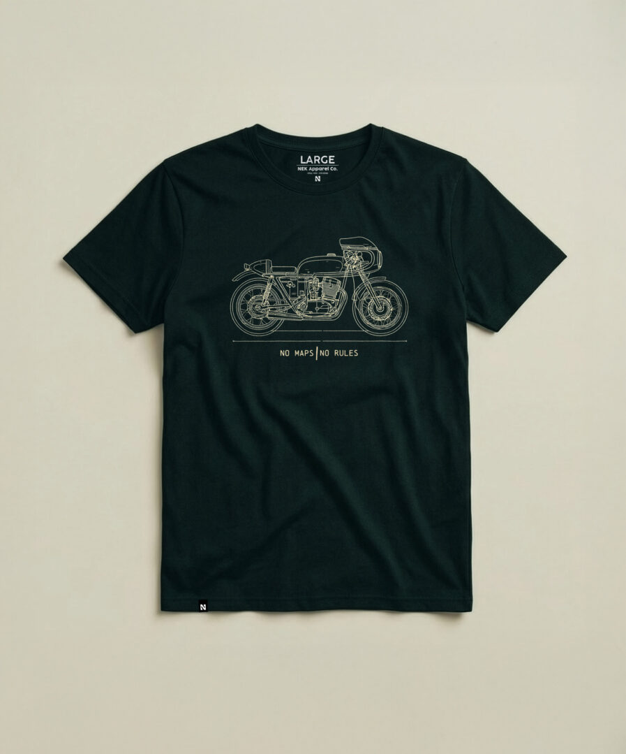 Kaferacer nije samo motocikl — to je izjava da nemaš vremena za komplikacije. Regular fit, štampa na prednjoj strani, mekani pamuk sa likrom.